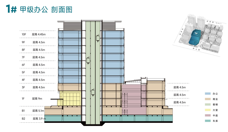 標(biāo)準(zhǔn)層開(kāi)闊少柱,4.5m層高,空間利用靈活高效,