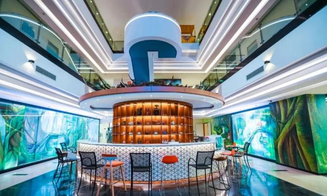 園區(qū)現(xiàn)已打造完成國內(nèi)辦公樓內(nèi)第一的熱帶雨林生態(tài)缸造景,命名為 “Re-Earth”,整個造景高13米、長8米、寬4米,采用滴灌、無土栽培、噴淋、太陽能追光鏡、太陽能發(fā)電、空氣能加熱、廢水收集處理過濾等一系列生態(tài)造景技術(shù),結(jié)合LED屏幕、投影燈、背景燈光及玻璃立體墻繪、生態(tài)景觀咖啡吧,打造了一個沉浸式雨林生態(tài)空間。