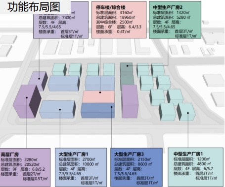 項(xiàng)目布局:規(guī)劃建設(shè)4層中型廠(chǎng)房14棟,4層大型廠(chǎng)房5棟,9層高層廠(chǎng)房2棟,并配套停車(chē)樓、食堂等設(shè)施。