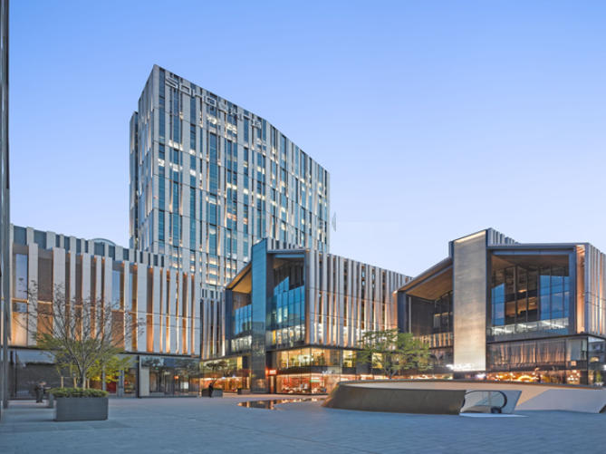 SOHO復(fù)興廣場(chǎng)位居上海內(nèi)環(huán)的中心——繁華的淮海中路CBD商圈。項(xiàng)目占地20,084平方米,包含約7.2萬(wàn)平米的地上面積及6.5萬(wàn)平米的地下面積,規(guī)劃總建筑面積為137,436平米,由一棟27層的辦公樓和4座裙樓構(gòu)成,集5A甲級(jí)辦公空間和商業(yè)配套于一體。