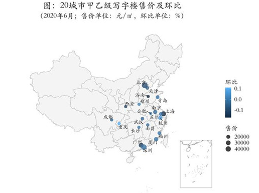 6月,20城市甲乙級寫字樓平均售價為21507元/㎡,同環(huán)比分別為3.49%和-0.03%。