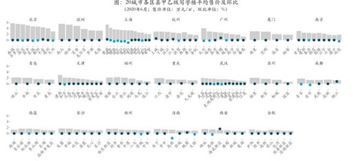 環(huán)比:6月,20城市140個區(qū)縣中,19.29%的區(qū)縣(27個)環(huán)比上漲,70%的區(qū)縣(98個)保持平穩(wěn),10.71%的區(qū)縣(15個)環(huán)比下降。其中濟南市高新區(qū)環(huán)比下降1.6%,降幅最大;西安市西咸新區(qū)環(huán)比漲幅最大,上漲1.55%。