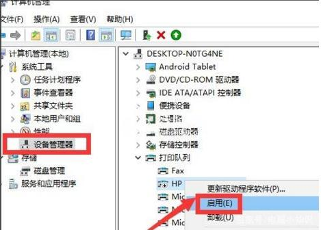器“列表中找到被禁用的打印機設(shè)備并右擊選擇”啟用“項即可。