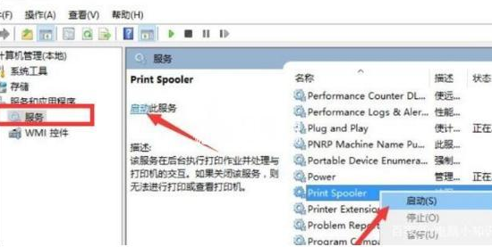 換到”計算機管理“一"服務(wù)”選項卡,找到“Pr i n t Spool e r”服務(wù)將其開啟即