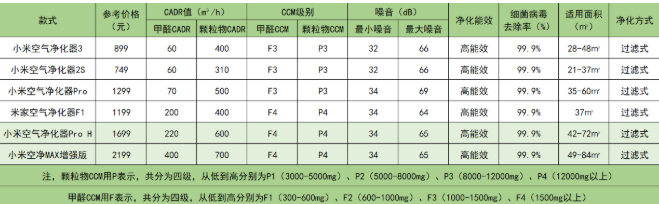 小米空氣凈化器主流產(chǎn)品的核心參數(shù)
