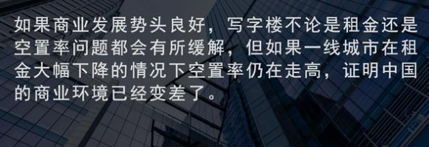 對(duì)此翟山鷹老師作出分析,事情發(fā)展的過(guò)程遠(yuǎn)比結(jié)果更重要,如果商業(yè)發(fā)展勢(shì)頭良好,寫(xiě)字樓自然會(huì)被商家占領(lǐng),不論是租金還是空置率問(wèn)題都會(huì)有所緩解,但如果連北上廣深這樣的一線(xiàn)城市,在租金大幅下降的情況下空置率仍在走高,證明中國(guó)的商業(yè)環(huán)境已經(jīng)變差了。