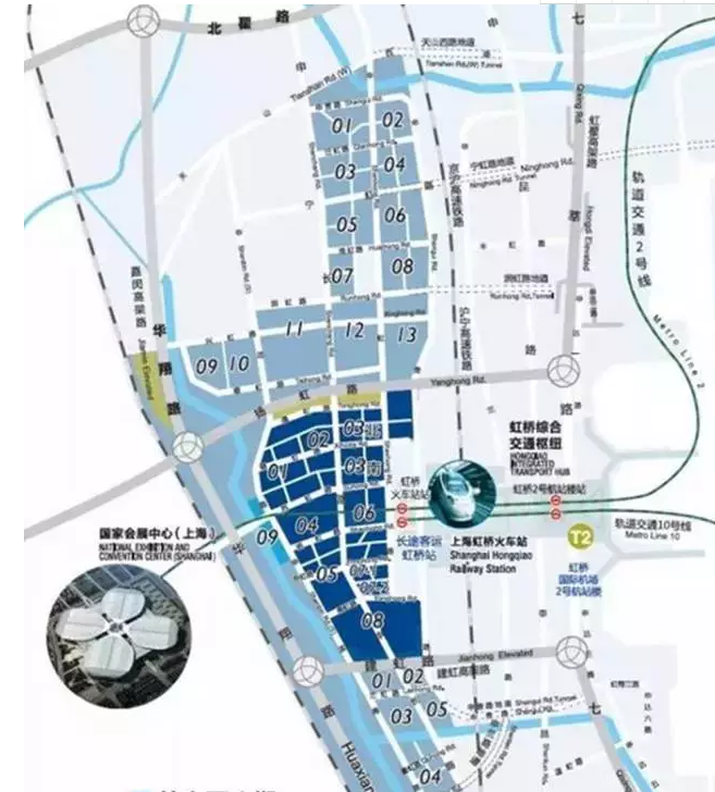 虹橋商務區(qū)中,有一塊商務區(qū)核心區(qū),分為虹橋商務區(qū)核心區(qū)南北片區(qū)和核心區(qū)一期、中國博覽會區(qū)域四個部分,共同組成4.76平方公里的虹橋商務區(qū)核心區(qū)。核心區(qū)開發(fā)規(guī)模為地上約500萬平方米,地下約280萬平方米。