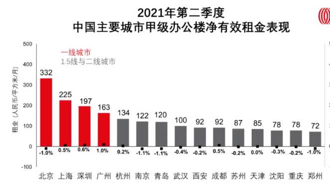 全國甲級辦公樓租賃需求持續(xù)回暖,成交量回升,釋放出積極訊號,使得甲級市場租金降幅持續(xù)收窄或租金繼續(xù)逐步回升。四個一線城市中,北京整體市場租金降幅收窄,但市場尚未止跌,環(huán)比下降1.0%;上海、廣州、深圳租金繼一季度回正后二季度持續(xù)小幅攀升,并且漲幅與一季度相比均有擴大。1.5線及二線城市租金方面表現(xiàn)均有一定程度的提升。