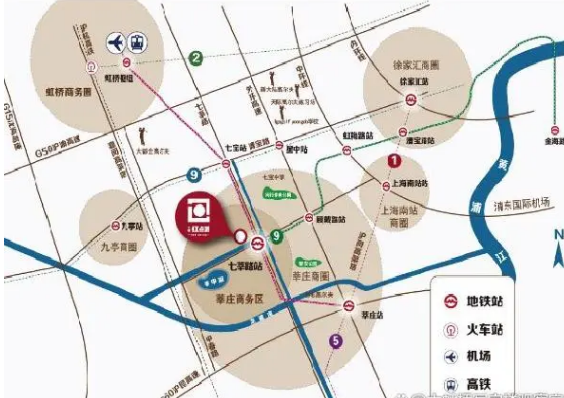 臨近地鐵12號線和數(shù)條公交線路,并貼近虹橋交通樞紐,此外,還有七莘路、中春路、顧戴路等多條重要道路可以直接通往G60高速、S4高速、S20高速和滬閔高架等快速道路,構(gòu)成了一個四通八達的交通網(wǎng)絡(luò)。